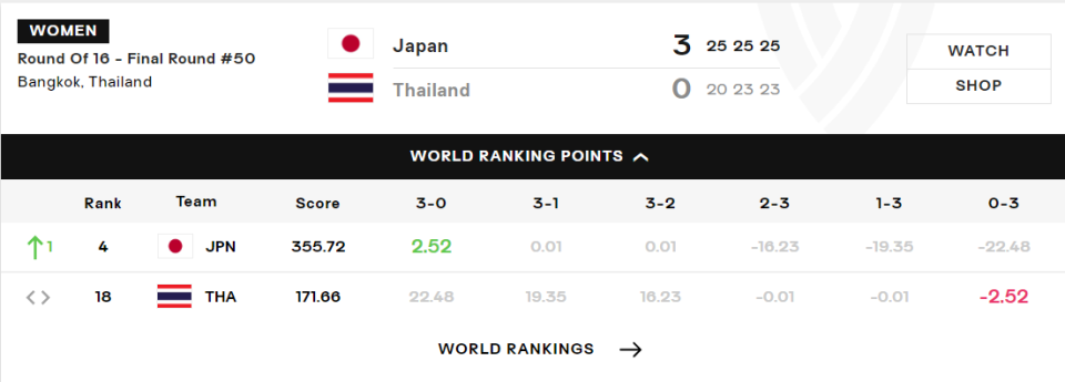 这场比赛日本女排3-0泰国拿到2.52分,日本女排总分355.72分再次重返了世界第四,中国女排是355.29分,中国女排需要在下一场比赛击败法国才能重新夺回世界第四的席位。